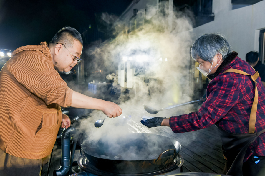历届秋食记的高潮——“新米菜饭”,今年再次点燃全场热情。星月辉映下,稻柴与香樟叶子燃起柴火灶,还原了田野炊烟的动人画面。农场新碾稻米烹制的菜饭和商榻雪珍农家乐在田边烹制的稻草扎肉、热气羊肉,香气直冲夜空,与淀山湖的“甲鱼裙边汤”一起,构成青浦版“顶配菜饭”。沈宏非、王丽萍、陈保平三位文化界名人兴致勃勃为三口稻柴大灶揭锅,为现场嘉宾现场复刻一次久违的、充满烟火气的集体记忆。
